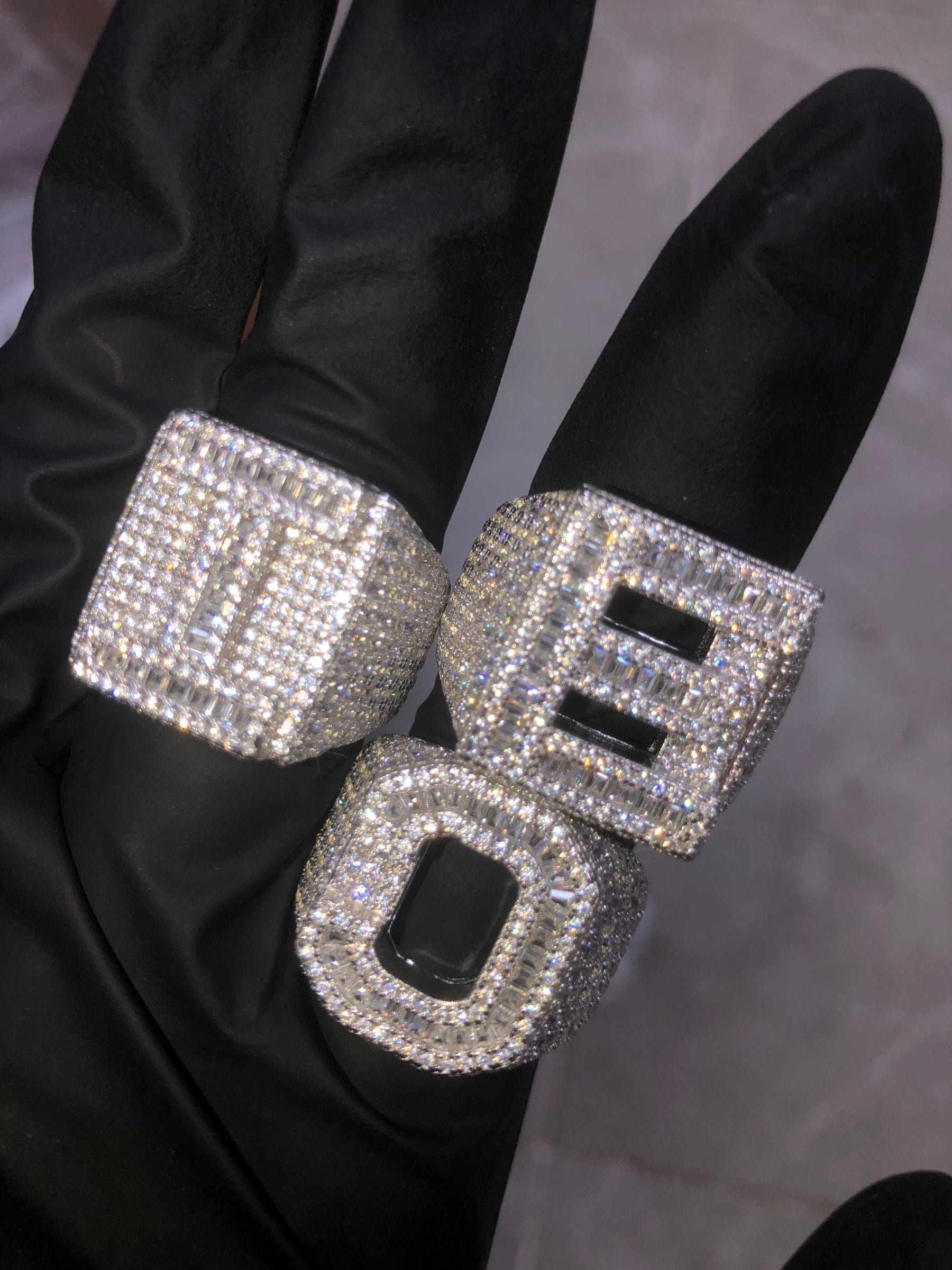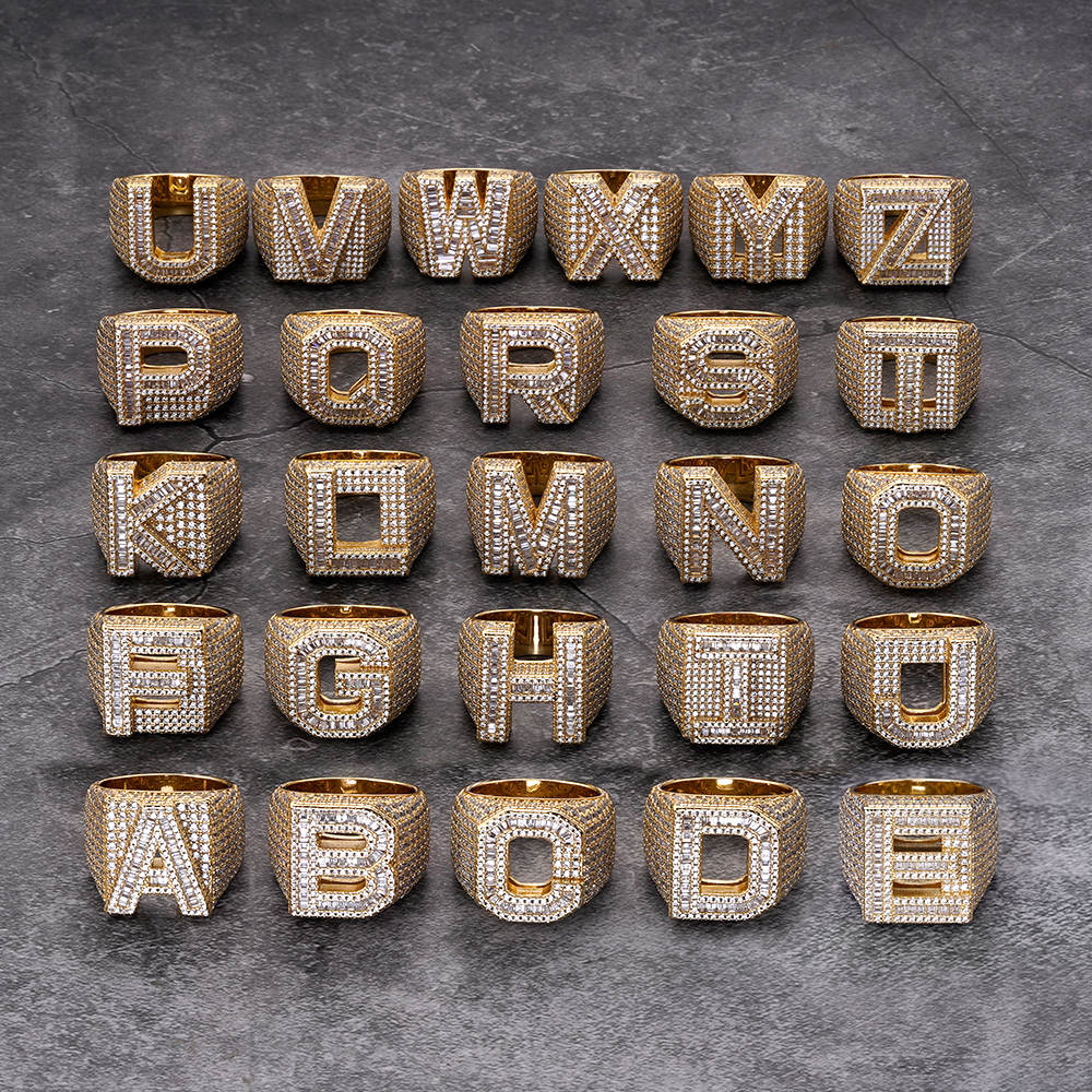 Kraftig bokstavsring täckt med briljantslipade och baguetteslipade stenar.